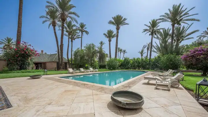 Découvrez cette villa de luxe au cœur de la Palmeraie, alliant confort moderne et charme marocain sur 4 hectares de paix et de tranquillité.
