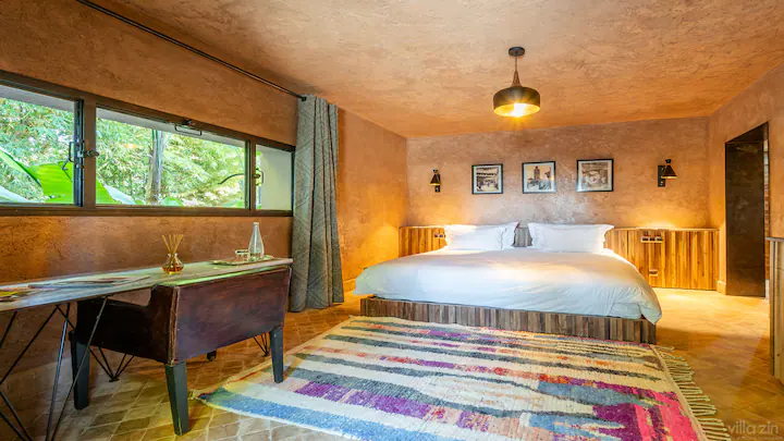Savourez la sérénité luxuriante d'une oasis privée dans cette exquise villa marocaine près de Marrakech. Nichés au milieu de vastes jardins, d'oliviers et de palmiers majestueux cédant aux vues de l'Atlas, les espaces de vie en plein air de la villa offrent une scène enchanteresse pour des réceptions de mariage, des événements spéciaux ou des réunions intimes avec des proches. Les suites de huit chambres, les installations de spa incomparables et 800 mètres carrés d'espace de vie intérieur accueillent des fêtes de seize personnes, avec deux maisons d'hôtes autonomes offrant une intimité aux couples ou aux petites familles. Située le long de la prestigieuse route Amizmiz, la Villa Zin se trouve à proximité des splendeurs du centre de Marrakech et de certains des plus beaux terrains de golf du pays.